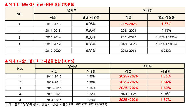 한국배구연맹(KOVO)는 지난 14일 "1라운드 평균 시청률이 2024~25시즌보다 남자부는 0.11% 포인트 감소(0.44%)했지만, 여자부는 0.15% 포인트 증가한 1.27%를 기록했다. 이번 시즌 여자부 1라운드 시청률은 2023~24시즌 1.18%를 넘어선 역대 최고 수치"라고 밝혔다.
