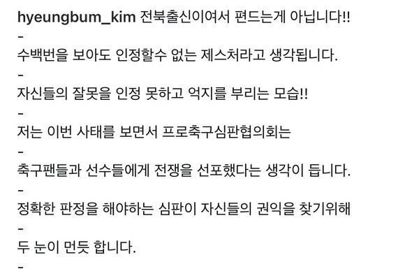 그러면서 "전북 출신이어서 편드는 게 아닙니다! 수백 번을 보아도 인정할 수 없는 제스처라고 생각됩니다. 자신들의 잘못을 인정 못 하고 억지를 부리는 모습! 저는 이번 사태를 보면서 프로축구심판협의회는 축구 팬들과 선수들에게 전쟁을 선포했다는 생각이 듭니다. 정확한 판정을 해야 하는 심판이 자신들의 권익을 찾기 위해 두 눈이 먼 듯 합니다"라고 일침을 가했다.
