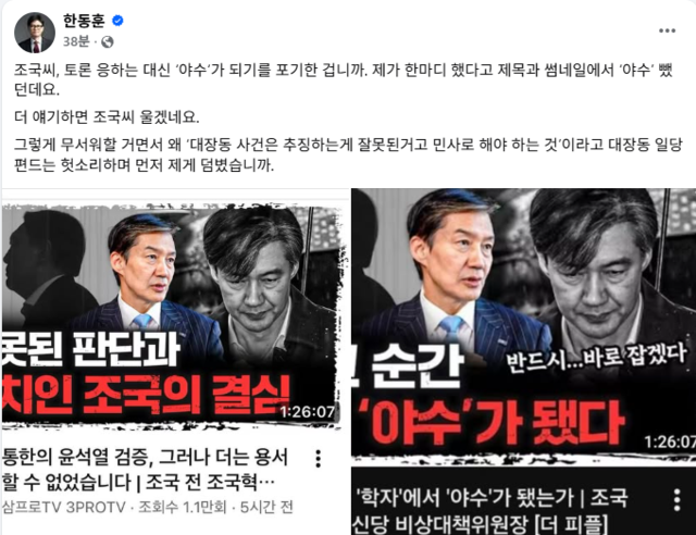 앞서 조국 전 위원장이 '삼프로TV, 더 피플' 코너에 출연한 영상이 이날 오전 유튜브에 업로드 됐다. 영상 썸네일에는 '바로 그 순간 조국은 야수가 됐다'는 문구가 적혀있었고, 이에 한동훈 전 대표가 해당 썸네일을 캡쳐해 함께 업로드하며 조국 전 위원장을 '야수'라고 지칭한 것.