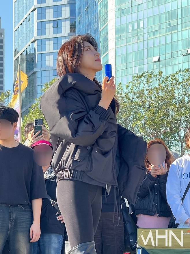 주변에는 촬영을 구경하는 시민과 팬들이 모여 현장의 열기를 더했다. 하지원은 카메라를 향해 미소를 보이거나, 제품을 들고 제스처를 취하며 화보 콘셉트에 맞는 다양한 포즈를 선보였다.