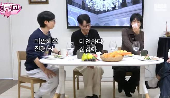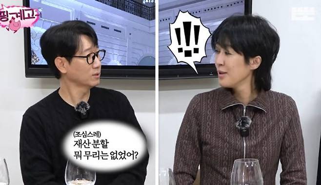 “툭 툭 궁금한 거 물어봐도 되나”라는 지석진의 질문에 홍진경은 “네 물어보시라. 오늘 얘기하려고 나온 거다”라고 흔쾌히 말했다. 이에 지석진은 “재산분할 뭐 무리는 없었어?”라고 물었고 유재석은 “갑자기 왜 재산분할 이야기를 하나”라고 말렸다.