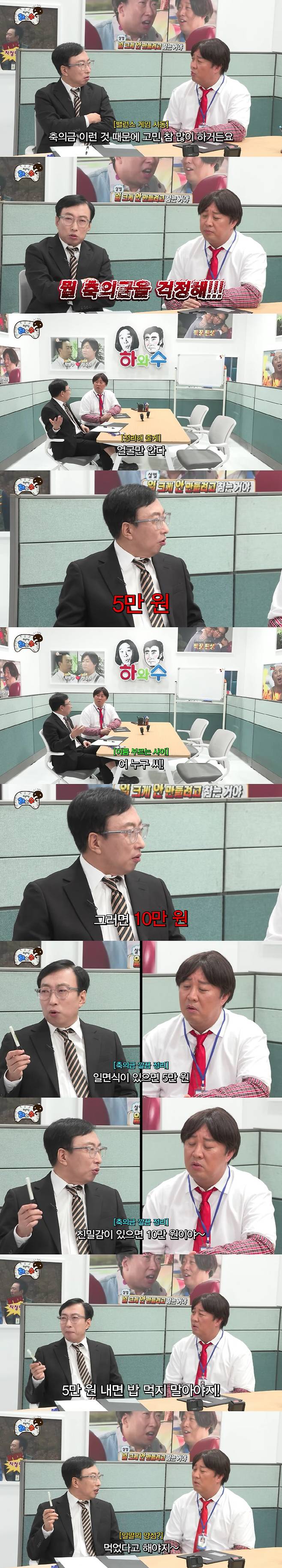 박명수는 "뭘 고민하냐. '안녕하세요' 정도로 얼굴만 아는 사이라면 5만 원, '어, 누구 씨'라고 부를 정도면 10만 원"이라며 "일면식이면 5만 원, 친밀감 있으면 10만 원이다. 일명 '친십일오'다"라고 말해 웃음을 자아냈다.
