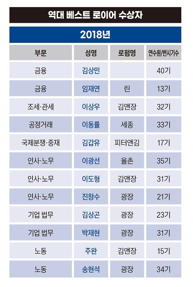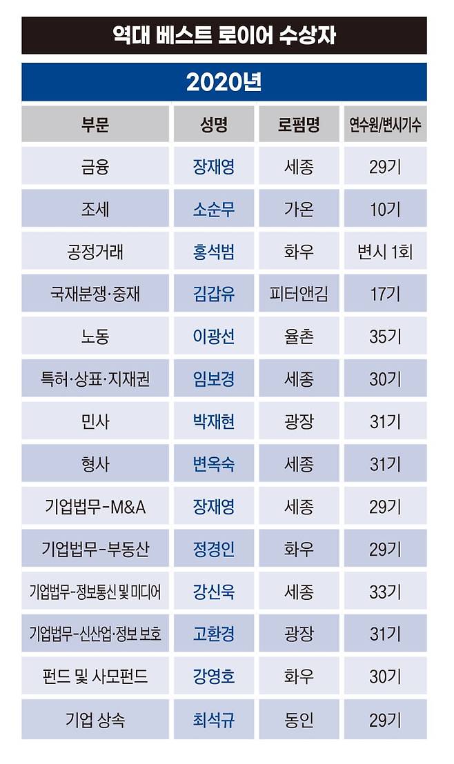 대형 로펌 소속이 아닌데도 베스트 로이어에 선정된 이들도 있어 눈길을 끈다. 국제중재 분야의 김갑유 피터앤김 변호사와 이정민 로제타 변호사, 부동산·건설업 부문의 이계형 예헌 변호사, 조세·관세 부문의 강남규 가온 변호사 등이 대표 적이다. 대형 로펌 소속이 아님에도 불구하고 당당히 베스트 로이어에 이름을 올리며 자신의 실력을 성과로 증명해냈다.