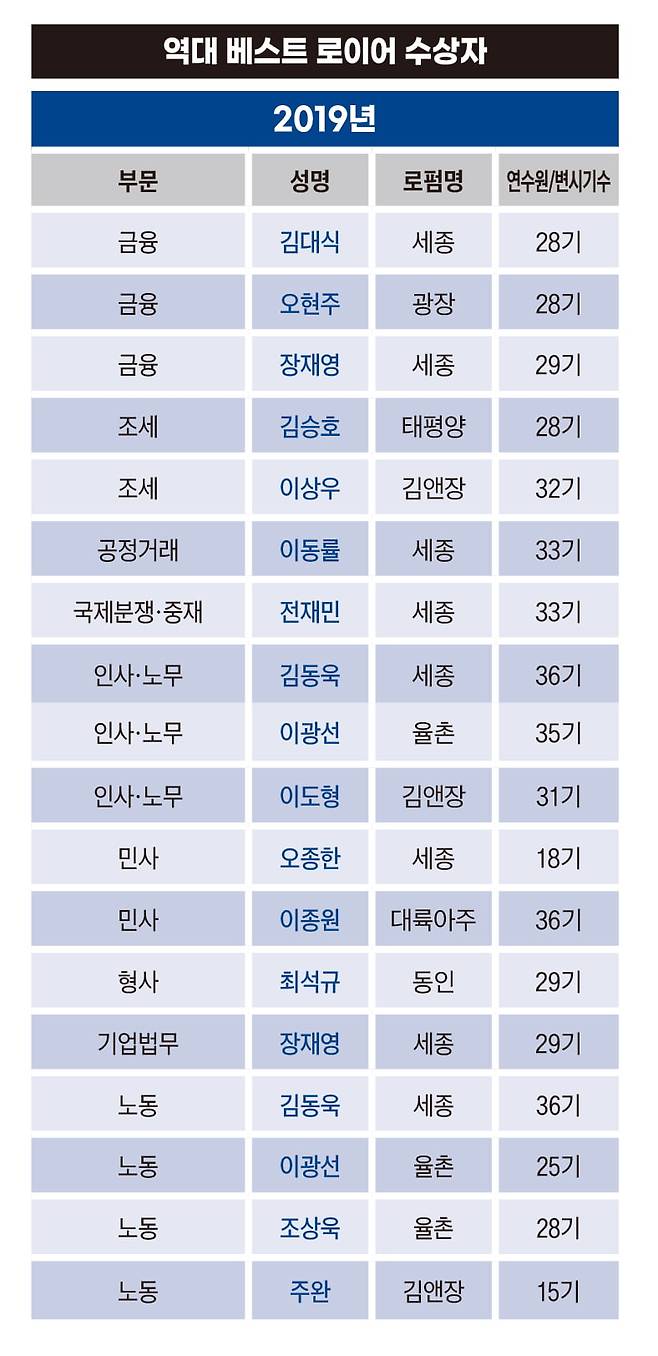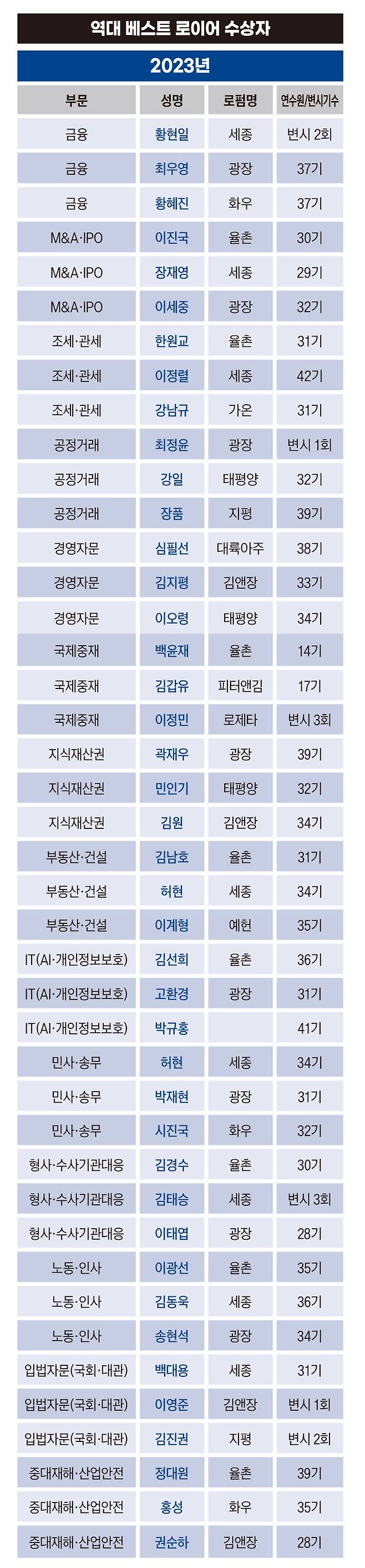 이외에도 입법자문에서는 백대용 세종 변호사가 가장 많이 베스트 로이어(총 3회)에 선정됐으며 중대재해 부문에서는 김태승 세종 변호사와 홍성 화우 변호사가 2023년부터 작년까지 연속으로 베스트 로이어에 뽑혔다.