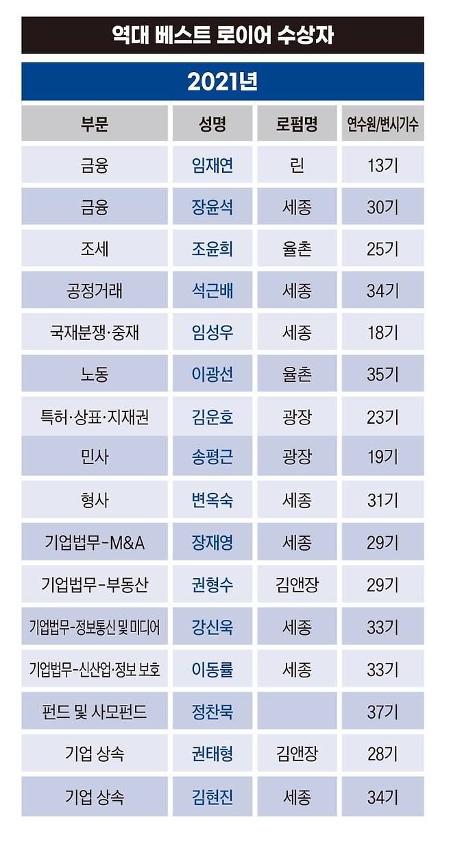 이런 궁금증을 풀기 위해 한경비즈니스는 2017년부터 ‘베스트 로펌’ 조사와 함께 ‘베스트 로이어’를 뽑아왔다. 각 부문별로 사내변호사들과 기업 법무 담당자들에게 ‘자신이 생각하는 최고의 변호사’를 써내도록 한 것이다. 가장 많이 이름이 거론된 변호사들을 꼽아 매년 상을 수여하고 있다. 3만5000명이 넘는 국내 변호사들 중에서 자신의 전문 분야에서 가장 높은 평가를 받는 주인공들이다.