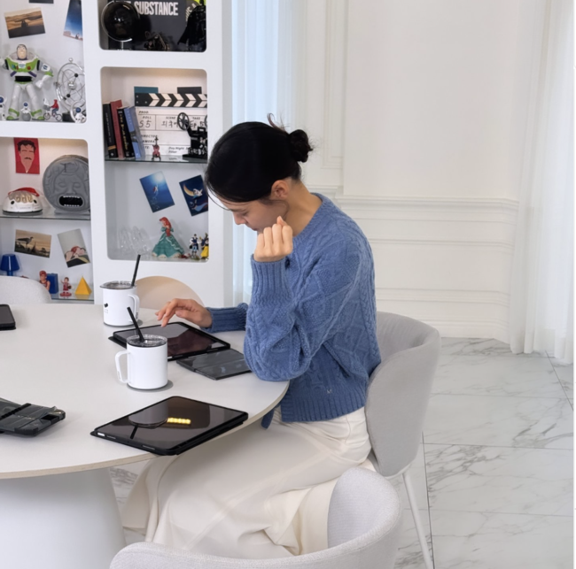 같은 날 올라온 또 다른 사진에서는 파란색 포근한 니트에 로우번으로 머리를 묶고 태블릿을 들여다보는 안현모의 옆모습이 담겼다. 해당 게시물에는 “라플위클리 이번주 주제는 외국어”라고 적혀 있으며, 지적인 분위기와 집중하는 모습이 눈길을 끈다.