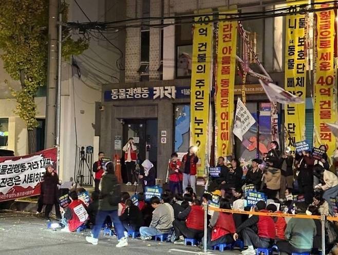 | ▲ 지난 13일 목요일 카라 시민행동, 카라지회가 서울 마포 더불어숨센터 앞에서 전진경 대표 사퇴를 촉구하는 시민 문화제를 열렸다. |