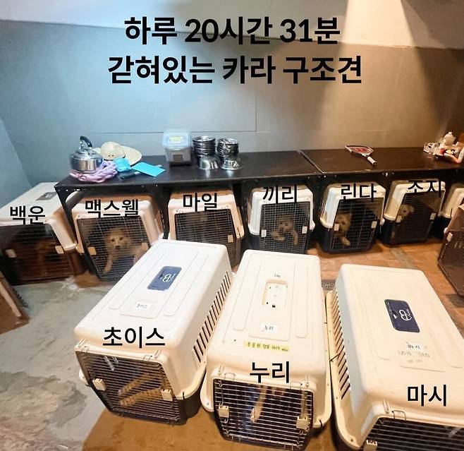 | ▲ 카라 노조가 카라 사측이 물 이동장인 '켄넬'에 구조동물 40여 마리를 하루 평균 20시간씩 가둬두는 학대를 하고 있다고 주장했다. |