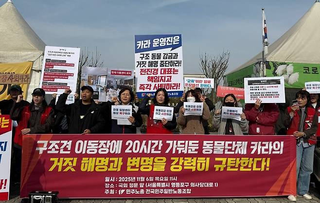 | ▲ 민주일반노조 서울본부 카라지회가 지난 6일 오전 국회 정문 앞에서 장시간 ‘켄넬링’ 중단과 농식품부의 즉각적인 실태조사를 촉구하는 기자회견을 열었다. |