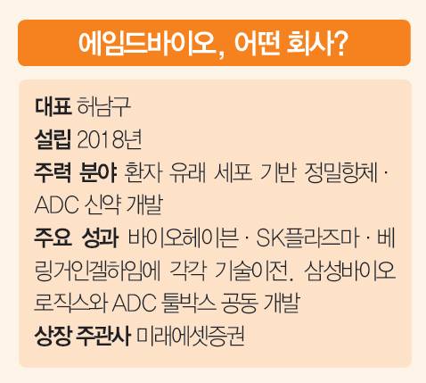 지난 2018년 설립된 에임드바이오는 환자 유래 세포를 기반으로 정밀항체와 ADC 신약을 개발하는 바이오 기업이다. 남도현 삼성서울병원 신경외과 교수가 10년 동안 수행한 국책과제 난치병 연구 성과를 바탕으로 창업했다. 당시 국책과제 주요 목표 중 하나가 연구 성과를 기반으로 한 한국형 바이오텍 창업이었다. 그 취지에 맞춰 설립된 회사다.