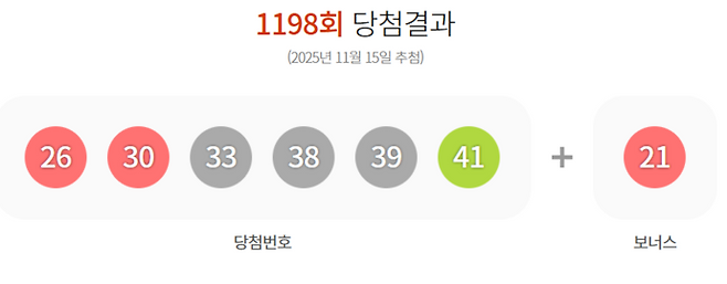 [오늘 로또]1198회 로또 당첨번호 ‘26, 30, 33, 38, 39, 41’…2등 보너스번호 ‘21’