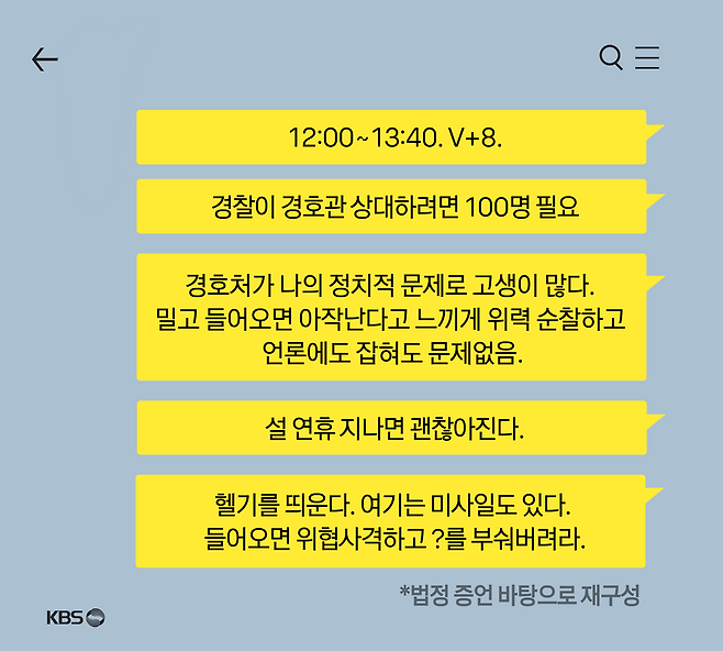 "설 연휴가 지나면 괜찮아진다", "여기는 미사일도 있다, 들어오면 위협사격하고 부숴버려라"라는 내용도 담겼습니다. '부숴버리는 대상이 누구냐'는 질문에 이 부장은 " 공수처"라고 답했습니다.
