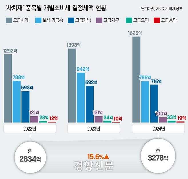 국회 기획재정위원회 소속 천하람 개혁신당 의원실이 16일 공개한 기획재정부의 ‘2022~2024년 품목별 개별소비세 결정세액 현황’ 자료를 보면, 보석·명품 시계 등 고액 사치품에 붙는 개별소비세 과세액은 2022년 2834억원에서 2024년 3278억원으로 2년 만에 15.6% 증가했다.