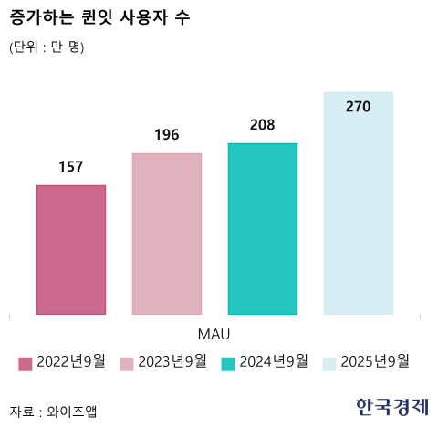 사용자 수도 급증하고 있다. 모바일앱 시장조사업체 와이즈앱에 따르면 지난 9월 기준 퀸잇의 월간활성사용자수(MAU)는 270만명으로 2022년 9월(157만명)에 비해 71.9% 늘었다. 패션 e커머스 앱 중에서는 에이블리(938만명), 무신사(703만명), 지그재그(409만명)에 이어 사용자 수 4위다. 1~3위 업체들이 주로 30대 이하를 겨냥한 점을 고려하면 4050 세대에선 퀸잇이 1위인 셈이다. 이런 인기 덕에 입점 브랜드 수도 2022년 700여 개에서 올해 8000여 개로 크게 증가했다.