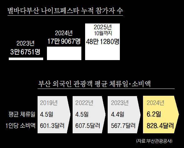 부산관광공사 관계자는 “외국인 관광객의 체류 기간이 늘고 소비가 증가하면서 ‘하루 여행 도시’였던 부산이 ‘머무는 도시’로 전환되고 있다”고 말했다.