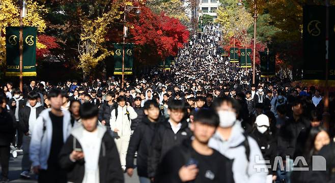 [서울=뉴시스] 황준선 기자 = 16일 서울 종로구 성균관대학교 인문사회과학캠퍼스에서 열린 2026학년도 수시모집 논술 시험을 마친 수험생들이 교정을 나서고 있다. 2025.11.16. hwang@newsis.com