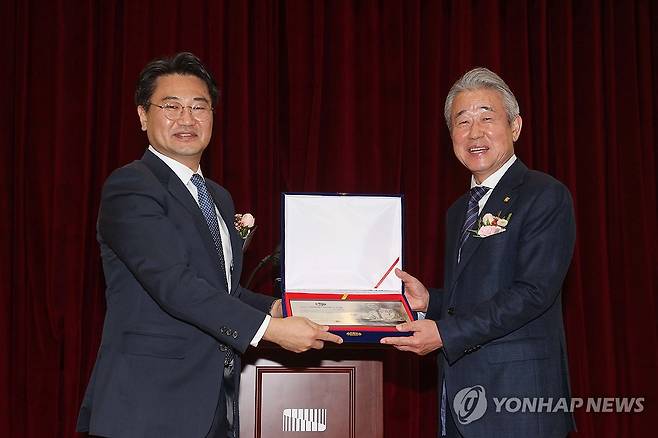 (서울=연합뉴스) 지난 15일 서울 동대문구 서울시립대학교에서 열린 한국전문경영인 대상 시상식에서 강호동 농협중앙회장(오른쪽)과 류준열 한국전문경영인학회장이 상패를 들고 기념 촬영하고 있다. 2025.11.16 [농협 제공. 재판매 및 DB 금지]