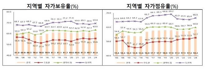 작년 자가를 보유하고 있는 가구는 전체 가구의 61.4%로 2023년(60.7%) 대비 0.7%포인트 상승했다. 도 지역 69.4%, 광역시 등 63.5%, 수도권 55.6%로 모두 전년 대비 자가보유율이 각각 0.8%포인트, 1.2%포인트, 0.5%포인트 높아졌다.