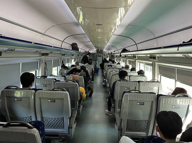 | ▲ 평일 낮 시간에도 객실은 만원이었다. 무궁화호는 KTX에 견줘 좌석의 간격이 넓고, 모두 순방향이어서 피로감이 훨씬 덜하다. |