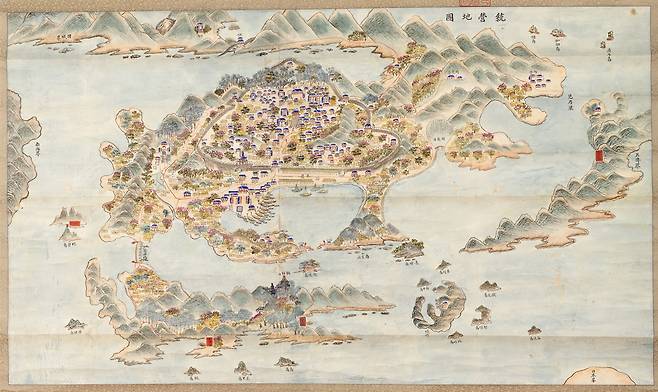 | ▲ 통영(1872년_지방지도) 지도 상단 가운데에 목을 막은 성곽과 원문(轅門)이 보인다. 통제영은 여황산과 남망산 사이의 지형을 따라 성곽을 쌓으니, 토실한 밤톨 모양이 되었다. 4대 문루와 북표루, 서표루, 동표루(標樓)가 보인다. 빼곡한 통제영 내부 묘사가 세밀하고, 네모난 '강구안'에 전선과 작은 배 정박이 정연하다. 남망산 좁은 해협에 동파수, 서파수를 두었고, 바다는 갑문으로 막았다. |
