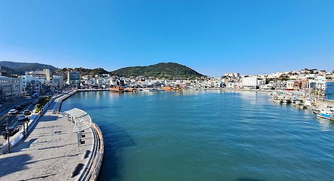 | ▲ 강구안 동파수와 서파수, 그리고 갑문이 있던 자리에 보행 교량이 좁은 바다를 건너고 있다. 다리 위에서 '세병관' 방향으로 바라 보자면, 당시의 '삼도수군통제영'이 저절로 그려진다. |