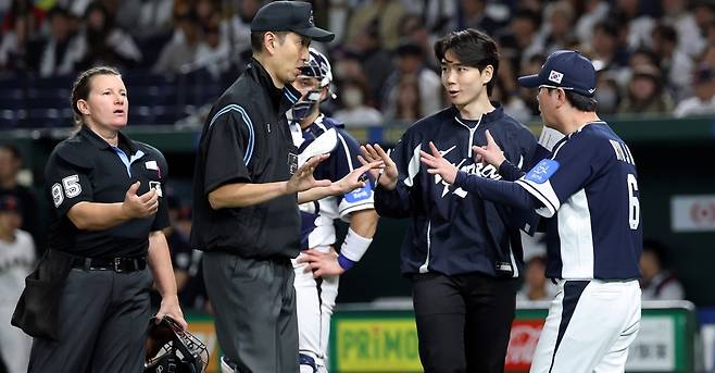 | ▲ 15일 일본 도쿄돔에서 열린 2025 K베이스볼 시리즈 대한민국과 일본의 평가전. 류지현 감독이 그라운드에 나와 심판진에게 어필하고 있다. |