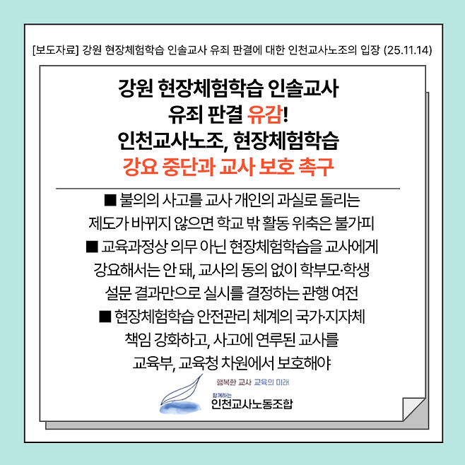 이어 "이러한 판결이 반복된다면 학교 밖 교육활동은 더욱 위축될 수밖에 없다"며 "교육과정상 의무가 아닌 현장체험학습을 교사에게 사실상 강제하는 관행을 즉각 중단하고, 학교 밖 교육활동에 대한 교사의 형사·민사 책임 범위를 재정립하라"고 촉구했다.