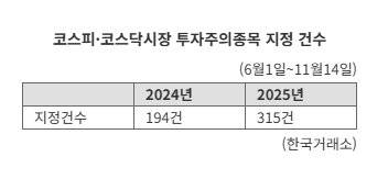 16일 한국거래소에 따르면 국내 증시 상승장이 본격적으로 전개된 올해 6월부터 이달 12일까지 코스피·코스닥시장에서 '투자주의종목'으로 지정된 건수는 315건으로, 전년 동기(194건) 대비 62.9% 증가했다.