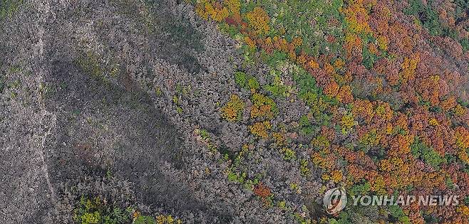 (대구=연합뉴스) 윤관식 기자 = 16일 대구 북구 함지산 일대의 숲에 단풍이 물드는 가운데 지난 4월 발생한 산불 흔적이 남아 있다.
