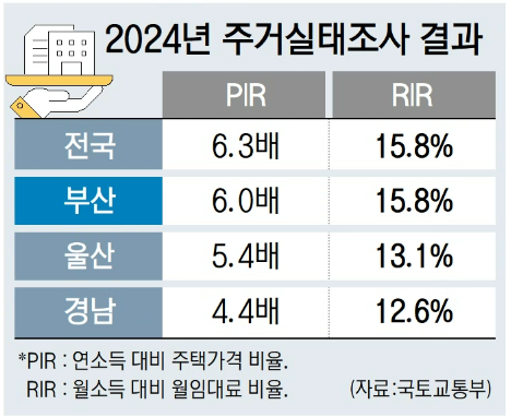 또 지난해 전국 임차(전월세) 가구의 ‘월 소득 대비 월 임대료 비중’(RIR)은 수도권이 18.4%로 가장 높았고 광역시는 15.2%, 도지역은 12.7%였다. 부산은 15.8%, 울산 13.1%, 경남은 12.6%였다.