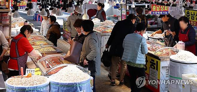 (인천=연합뉴스) 임순석 기자 = 본격적인 김장철을 맞아 16일 인천 남동구 소래포구 전통어시장을 찾은 시민들이 김장용 젓갈을 구입하고 있다. 2025.11.16