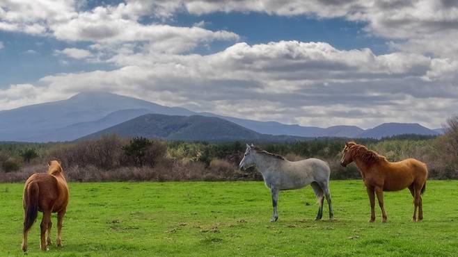 하늘의 구름과 산을 배경으로, 가까이 자리한 오름 위에 평온하게 서 있는 말. 초원 속 어딘가를 응시하는 말들의 모습이 제주의 자연과 어우러지며 또 하나의 풍경을 만들어낸다. 멀리 산을 바라보는 홀로 선 말의 뒷모습은 많은 생각을 불러일으킨다.