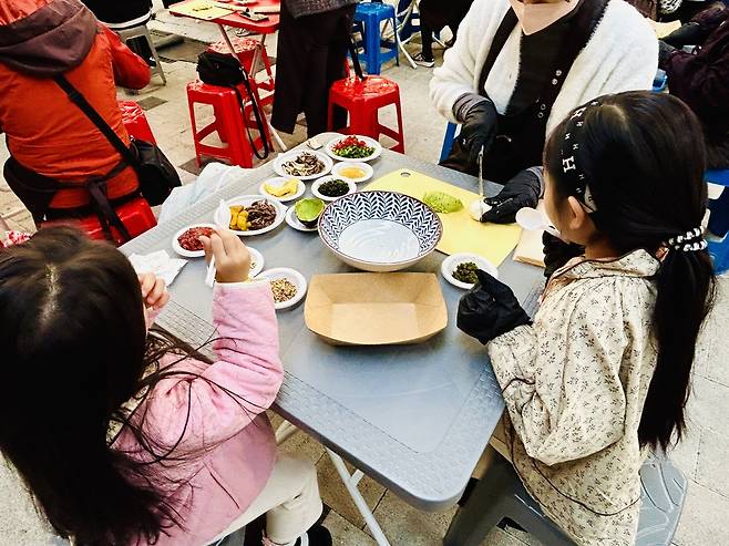 | ▲ 광천문화시장에서는 개장 100주년을 맞아 로컬푸드 축제인 '홍성 백반 페스타'가 지난 15일부터 열렸다. 주말인 16일 찾은 행사장에서는 어린이들이 가족과 함께 홍성의 다양한 식재료를 이용해 비빔밥을 만들고 있다. |