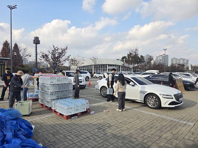 | ▲ 11월16일, 파주시 단수 3일차 파주시민들이 운정건강공원 앞 생수 배부처에서, 생수를 수령하고 있다. |