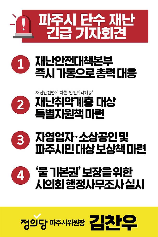 정의당 파주시위원회 김찬우 위원장과 운영위원회는 지난 114일 파주시 전역 17만 가구에 발생한 대규모 단수 사태와 관련해, 파주시와 한국수자원공사의 초기 대응을 강하게 규탄하며 재난 대응 체계의 근본적 쇄신을 촉구하는 입장을 밝혔다.