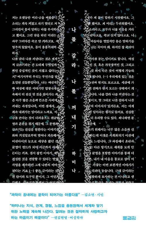 하미나는 ‘두 개의 언어’로 과학과 비과학의 경계를 넘는다. 과학철학 연구자로서 익숙했던 ‘이성-과학-머리’의 틀을 깨고 ‘감정-자연-몸’의 말을 함께 써서 차별과 배제가 없는 ‘진실’을 찾아나간다. 1970년대 ‘외계인에게 지구를 소개하는 프로젝트’에서 ‘전쟁, 질병, 가난’을 빼기로 한 결정이 상징하는 ‘어떤 권위’가 지워버린 세계가 아름답고 빼곡하게 담겨 있다.