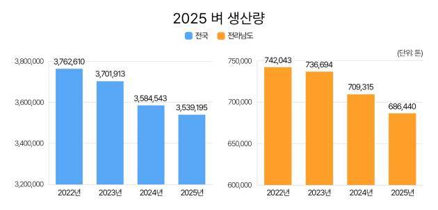 우리나라 연간 쌀 생산량은 2022년 376만 4000t, 2023년 370만 2000t, 2024년 358만 5000t에 이어 올해까지 4년 연속 감소하며 역대 최저치를 갱신하고 있다.