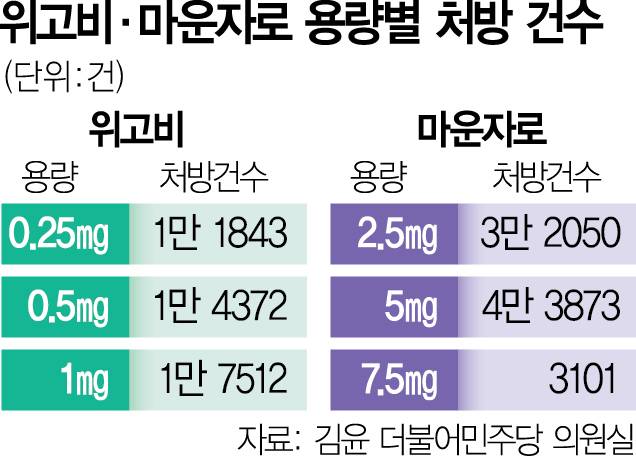 17일 국회 보건복지위원회 소속 김윤 더불어민주당 의원이 건강보험심사평가원으로부터 제출받은 10월 기준 ‘DUR 처방점검 완료 기준 비만약 처방’ 자료에 따르면 마운자로의 최저 용량인 2.5㎎ 처방건수는 3만 2050건으로 위고비의 최저 용량인 0.25㎎ 처방(1만 1843건)보다 약 2.7배 많았다. 최저 용량 처방량은 신규 환자 유입 흐름을 가장 직접적으로 보여주는 지표다. 처음 비만약을 처방할 때는 대부분 최저 용량을 처방하기 때문이다.
