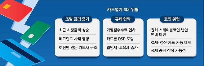 카드업계가 사면초가에 몰렸다. 조달 비용은 늘고 수수료와 카드론 등 규제 압박은 갈수록 커지고 있다. 여기에 카드 기능을 상당 부분 대체할 수 있는 스테이블코인 시대도 성큼 다가오면서 카드업계의 위기감이 커지는 모양새다.