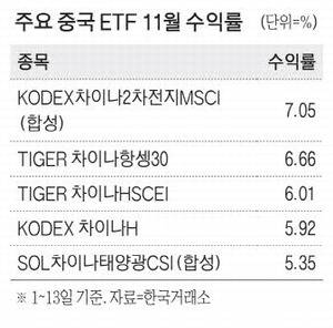 16일 한국거래소에 따르면 이달 들어 지난 13일까지 국내에 상장된 중국·홍콩 ETF 43개 가운데 마이너스 수익률을 기록한 상품은 단 2개에 그쳤다. 특히 중국 정부 지원 정책의 직접적인 수혜를 받는 2차전지·전기차·태양광 등 신성장 섹터를 추종하는 ETF가 강세를 보였다. 'KODEX 차이나2차전지MSCI(합성)'가 이 기간 7.05%로 가장 높은 수익률을 기록했고, TIGER 차이나전기차SOLACTIVE(4.83%), SOL 차이나태양광CSI(합성)(5.35%) 등도 우수한 성과를 냈다.