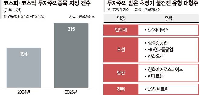 전력기기 업종의 LS일렉트릭과 조선업의 삼성중공업, 한화오션, HD현대중공업도 최근 한 달 사이 투자주의종목으로 지정됐다. 9월에는 방산 대표주 한화에어로스페이스가 투자주의를 받았다.