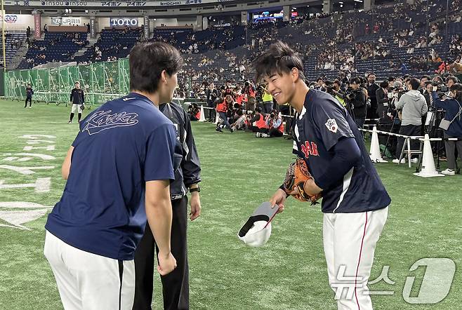 (도쿄=뉴스1) 구윤성 기자 = 16일 오후 일본 도쿄돔에서 열리는 월드베이스볼클래식(WBC) 대비 평가전 '2025 케이 베이스볼 시리즈(K-BASEBALL SERIES)' 대한민국과 일본과의 2차전 경기를 앞두고 대한민국 대표팀 투수 이호성이 일본 니시카와 미쇼를 찾아 전날 사구를 던진 것에 대해 사과하고 있다. (KBO 제공. 재판매 및 DB 금지) 2025.11.16/뉴스1