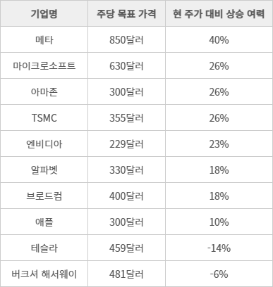 마이크로소프트(26%), 아마존(26%), TSMC(26%), 엔비디아(23%)가 그 뒤를 이었습니다. 알파벳(18%), 브로드컴(18%), 애플(10%) 역시 추가 상승 여력이 기대됩니다.