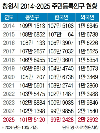 현재 창원시는 특례 조건인 인구 100만 명이 무너질 위기다. 2010년 마창진 통합 당시 외국인 등을 포함해 총인구는 110만 3363명에 달했다. 그러나 올해 10월 기준 101만 5120명까지 낮아졌다. 이 추세라면 내년이나 내후년께 100만 명 아래로 떨어질 것으로 보인다.