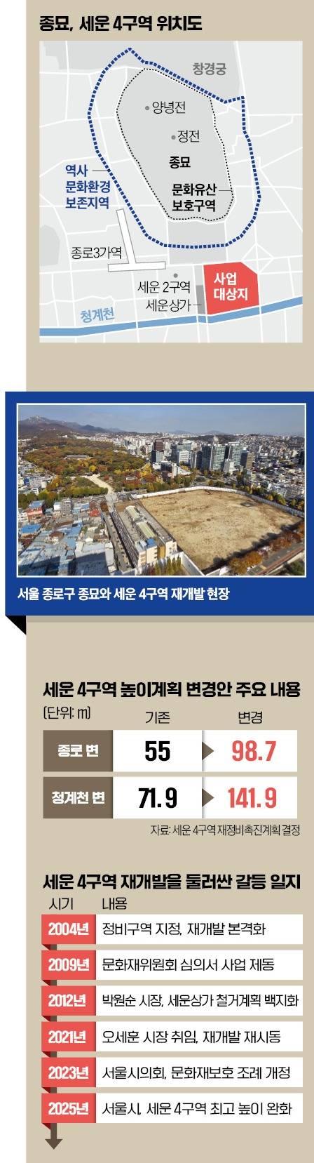 서울 종로구의 재개발 구역인 세운 4구역에 최고 142m의 고층 빌딩을 짓겠다는 서울시 결정을 놓고 극한 대립이 벌어지고 있다. 세운 4구역에 고층 빌딩이 들어서면 170m가량 떨어진 유네스코 세계유산인 종묘(宗廟) 경관에 심각한 문제가 생기니, 모든 수단을 동원해 이를 막겠다는 게 중앙정부와 여당 방침이다. 반면 오세훈 시장은 “재개발하면 종묘의 가치가 오히려 높아진다”고 반박한다. 문제가 된 서울시의 재개발 계획은 어떤 것이고 취지는 무엇인지, 국가유산청과 고고학계는 왜 반대하는지 정리했다.
