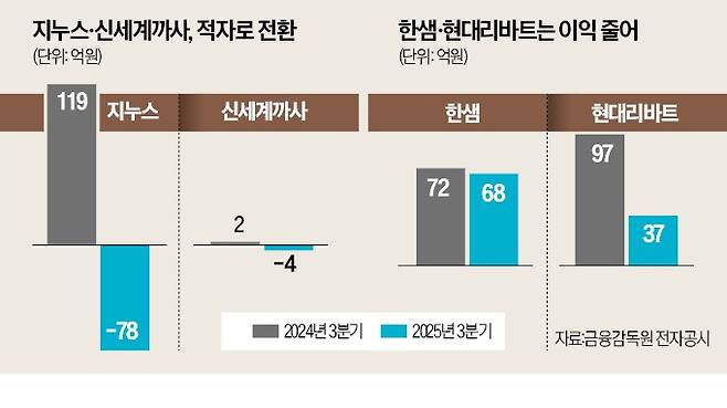 현대백화점그룹의 또 다른 가구 계열사 현대리바트의 실적도 악화됐다. 3분기 영업이익은 61.7% 감소한 37억원에 불과했고, 매출도 25% 줄어든 3407억원에 그쳤다. 신세계그룹의 신세계까사 역시 3분기에 적자를 기록했다. 정부의 고강도 부동산 규제와 지방 부동산 경기 침체로 신규 입주 물량이 줄어든 데다, 원·달러 환율 상승으로 자재비가 늘면서 수익성이 악화됐다.
