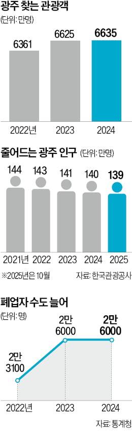 광주광역시는 노벨상의 도시다. 지난해 노벨문학상 수상자인 한강의 대표작 <소년이 온다>는 광주에서 벌어지는 이야기다. 소설의 배경을 따라 걷는 ‘소년의 길’은 인문 투어 명소로 떠올랐다. 노벨평화상을 받은 김대중 전 대통령의 정치적 고향도 광주다. 노벨상의 도시라는 말에는 ‘민주화의 도시’라는 이미지가 배어 있다. 지난해 노벨경제학상 공동 수상자 제임스 로빈슨 미국 시카고대 교수는 민주주의가 경제 발전의 핵심 동력이라고 주장해온 학자다. 광주의 현실은 이런 진단과 다소 동떨어져 있다. 이렇다 할 산업 기반이 없어 활력을 잃어가고 있어서다. 2022년 2만3000명 선이던 광주 내 폐업자는 지난해 2만6000명으로 늘었다. 청년들이 떠나면서 인구도 감소세다. 강기정 광주시장이 최근 한국을 방문한 로빈슨 교수를 만나 조언을 구한 이유다.