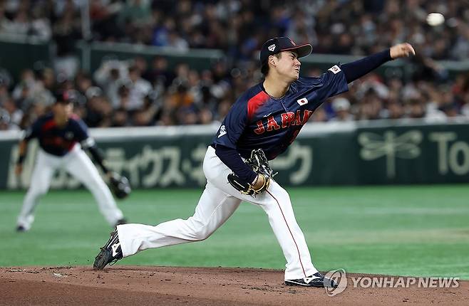(도쿄=연합뉴스) 이동해 기자 = 16일 일본 도쿄돔에서 열린 2025 K베이스볼 시리즈 대한민국과 일본의 평가전. 1회말 일본 선발투수 가네마루 유메토가 역투하고 있다. 2025.11.16