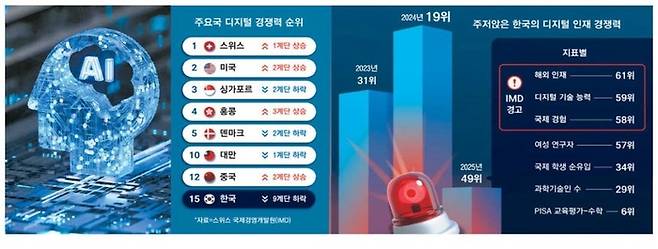 IMD도 “한국과 노르웨이가 각각 9계단, 3계단 떨어지며 올해 10위권 밖으로 밀렸다”고 이례적으로 언급했다. 많은 평가 중 하나일 뿐이라며 간단히 넘어가기에는 인공지능(AI)·디지털 후진국으로 전락할 위기에 놓인 대한민국의 현실과 미래가 녹록지 않다는 지적이 나온다.