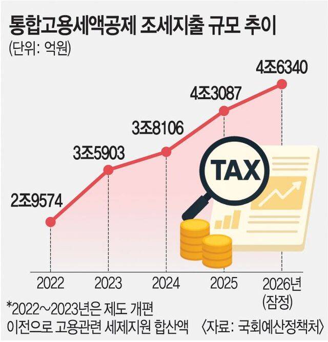통합고용세액공제는 고용을 늘리거나 유지한 기업에 법인세 등 세금을 감면해 고용 부담을 덜어주는 제도다. 모태가 된 고용증대세액공제가 2017년 도입된 뒤 2023년 중소기업 사회보험료·경력단절여성·육아휴직 복귀자·정규직 전환 세액공제 등을 통합하는 방식으로 개편됐다. 지난 7월 발표된 내년 세제개편안은 상시근로자 1명당 공제를 연간 최대 2400만원까지 늘리는 내용을 담고 있으며 이에 따라 조세지출은 전년보다 3253억원(7.5%) 증가한 4조6340억원으로 추산된다. 전체 조세지출 항목 가운데 두 번째로 크다.